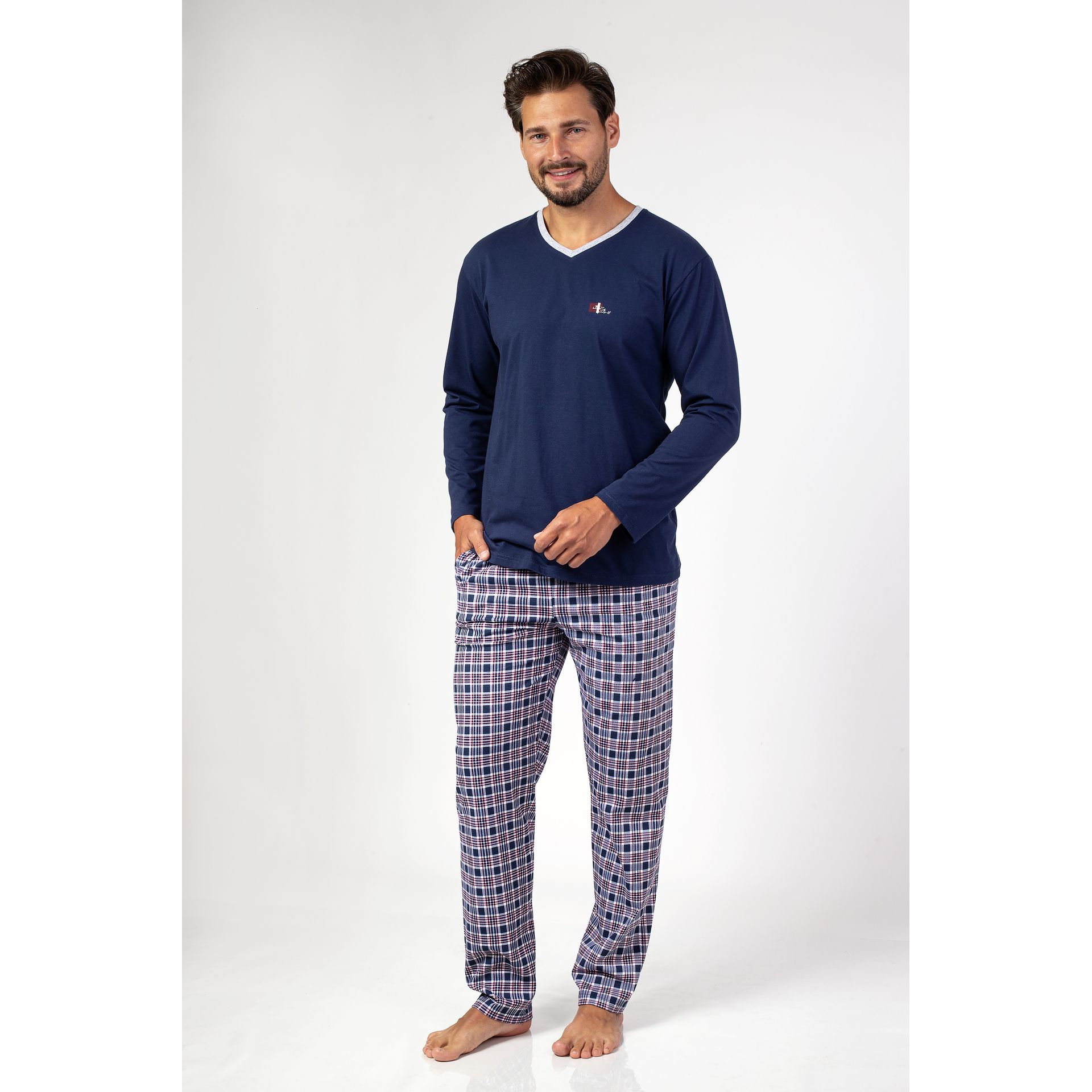473 pánske pyžamo z 100 % bavlny. Tričko s potlačou na hrudi a módne kárované nohavice s vreckami. Veľkosti: M – XXL.